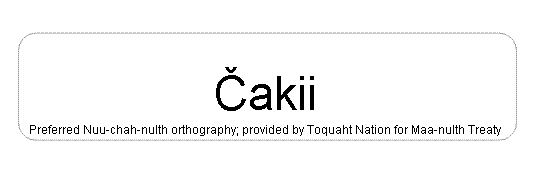 Within the traditional territory of the Toquaht First Nation. "The name means ' water on top' (July 1983 interview by Denis St. Clair with Toquaht Elders Jimmy McKay, Sammy McKay and Chief Bert Mack.) ...likely a reference to a pond or pool on top" (advice from Toquaht Elder Anne Mack, shared November 2010)